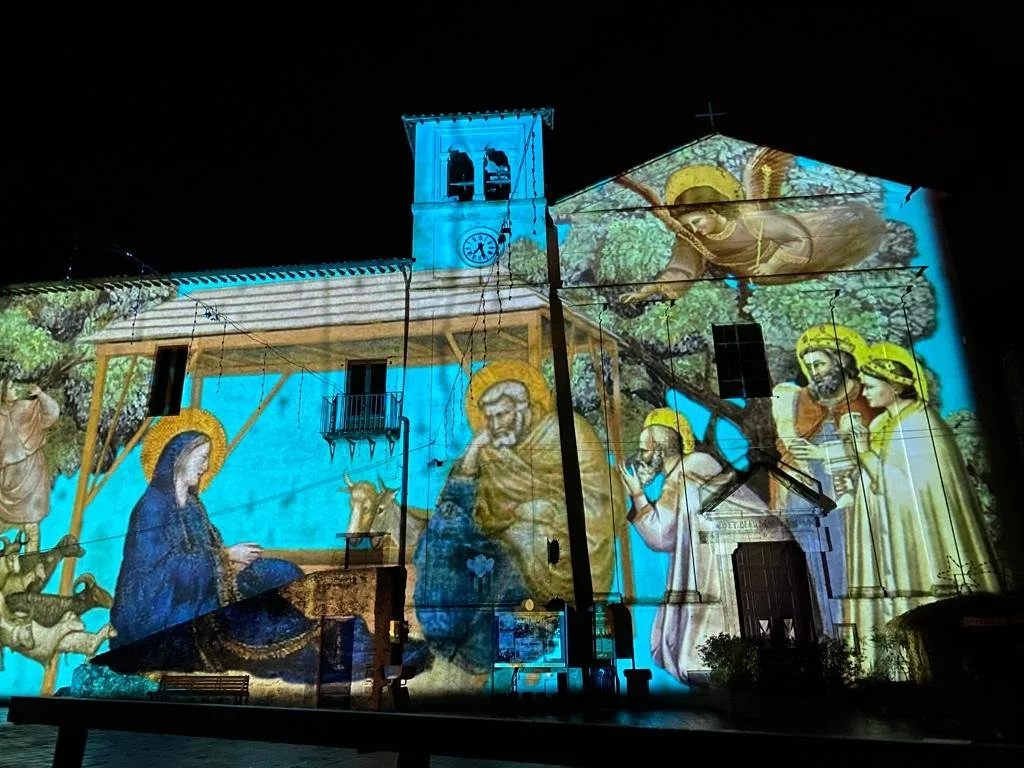 Con i nuovi mezzi tecnologici, il video-mapping e l'invenzione dell'artista Pino Di Buduo, dei suoi collaboratori e ricercatori, il luogo scelto (la piazza, il castello, la chiesa) si trasforma nella tela gigante di un pittore. Qui i personaggi più famosi e le immagini sul tema della natività nei dipinti di Giotto, diventano giganti, si muovono e raccontano la Natività riempiendo le mura del luogo scelto. Le proiezioni giganti andranno a coprire le pareti esterne delle chiese in modo che i visitatori si immergono nelle immagini del Natale dipinte da uno dei più grandi artisti del mondo. Le immagini verranno accompagnate da musiche e canti celestiali classici e contemporanei in modo che l'immersione dei sensi sia completa.